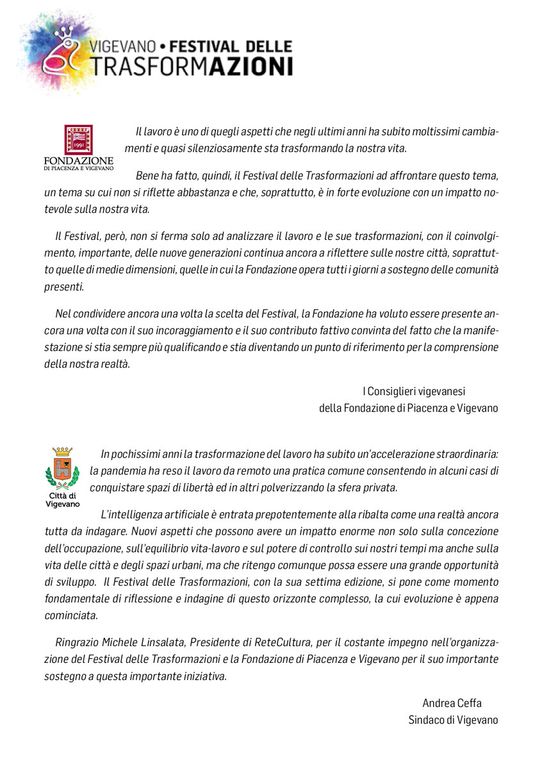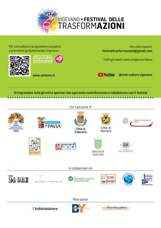 Il Festival delle Trasformazioni ha ottenuto il patrocinio di Regione Lombardia, Provincia di Pavia, Città di Vigevano, Città di Mortara, Anci Nazionale, Anci Lombardia, Diocesi di Vigevano, Fondazione Roncalli, Pavia Capitale della Cultura d’impresa 2023.
