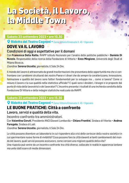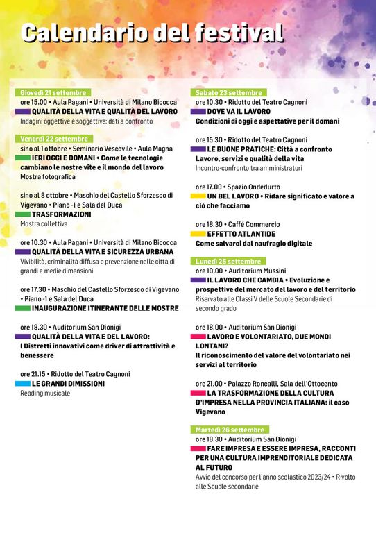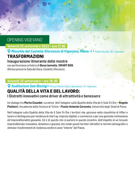 Il 22 settembre è, inoltre, in programma l’Opening di Vigevano - città ispiratrice del Festival che lo ospiterà fino alla conclusione – con la presentazione di alcuni tra i dati relativi della ricerca pubblicata annualmente da Il Sole 24 Ore sulla Qualità della Vita. Il dialogo tra Marta Casadei, co-curatrice dell’Indagine sulla Qualità della Vita de Il Sole 24 Ore, Angelo Pichierri, Accademia delle Scienze di Torino, e Flavio Antonio Ceravolo, Università degli Studi di Pavia, tratterà dei Distretti innovativi come driver di attrattività e benessere.