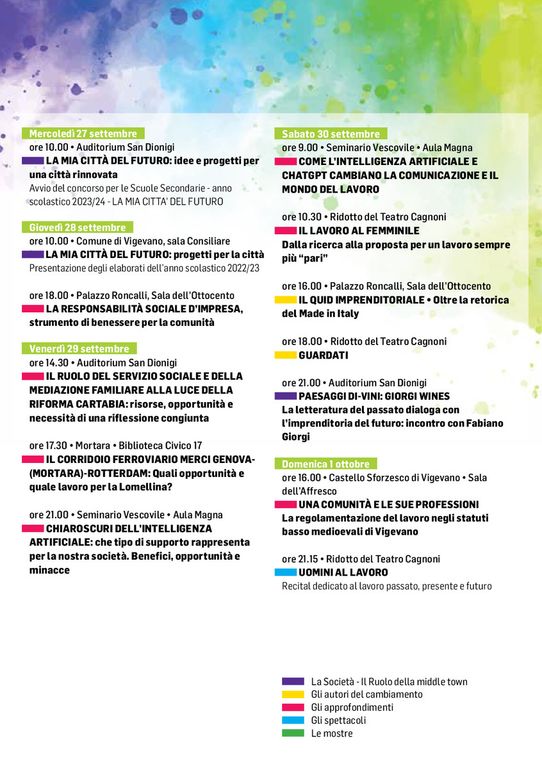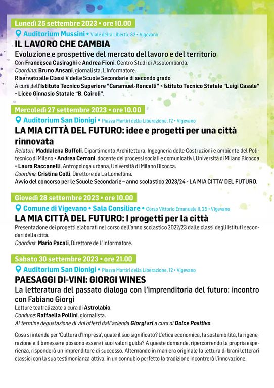 Inoltre, come nelle passate edizioni, la manifestazione coinvolgerà alcune classi degli istituti vigevanesi con confronti esclusivi sull’evoluzione e sulle prospettive del mercato del lavoro e del territorio, e vedrà l’avvio del concorso - “La mia città del futuro” (27 settembre) - dedicato alle scuole secondarie, nel quale gli studenti, i cittadini del futuro, con i loro progetti racconteranno la loro idea di città rinnovata.