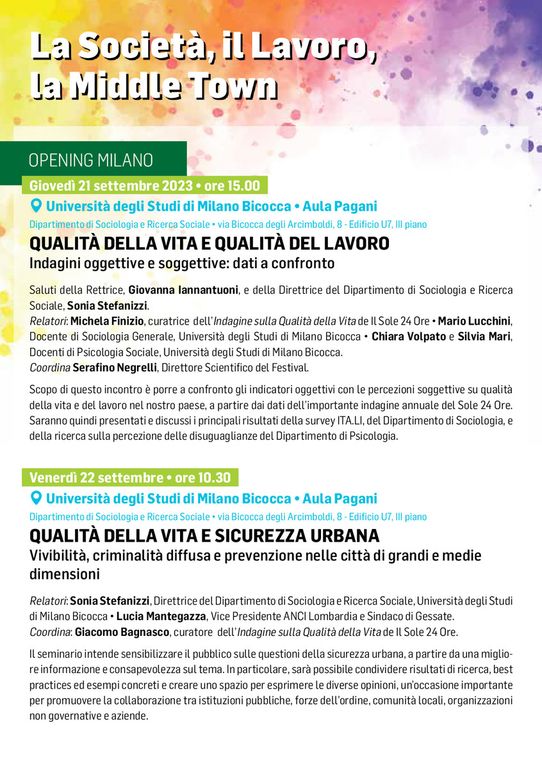 Prenderà il via a Milano con i due appuntamenti in programma il 21 e 22 settembre all’Università Milano Bicocca che tratteranno di temi particolarmente attuali: “Qualità della vita e qualità del lavoro” e “Qualità della vita e sicurezza urbana”. Il primo dibattito (21 settembre) coinvolgerà, in qualità di relatori: Michela Finizio, curatrice del progetto sulla Qualità della vita de Il Sole 24 Ore, Mario Lucchini, Docente di Sociologia Generale, Università di Milano Bicocca, Chiara Volpato, Docente di Psicologia Sociale, Università di Milano Bicocca, con il coordinamento di Serafino Negrelli, Direttore Scientifico del Festival. Scopo di questo incontro è porre a confronto gli indicatori oggettivi con le percezioni soggettive su qualità della vita e del lavoro nel nostro Paese, a partire dai dati dell’importante indagine annuale del Sole 24 Ore. Saranno quindi presentati e discussi i principali risultati della survey ITA.LI, del Dipartimento di Sociologia, e della ricerca sulla percezione delle disuguaglianze del Dipartimento di Psicologia.