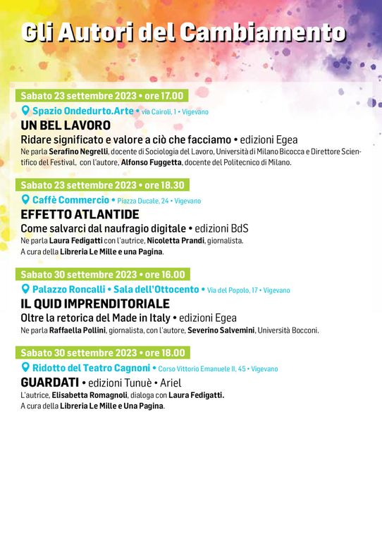Il Festival delle Trasformazioni ospita autori di libri dedicati al tema - come: Alfonso Fuggetta, docente del Politecnico di Milano, la giornalista Nicoletta Prandi, Severino Salvemini, Università Bocconi, ed Elisabetta Romagnoli, autrice di graphic novel – oltre a spettacoli teatrali, mostre e momenti di approfondimento.