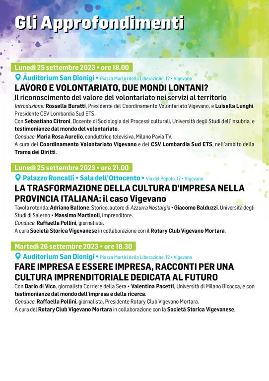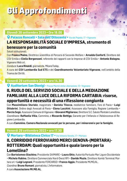 La manifestazione è organizzata da Rete Cultura Vigevano, in collaborazione con Il Sole 24 Ore, la Libreria Le Mille e Una Pagina, CSV Lombardia Sud e Trama dei Diritti, il Coordinamento Volontariato Vigevano e il Pool Vigevano Sport, ed è realizzata grazie al supporto della Fondazione di Piacenza e Vigevano, del Dipartimento di Sociologia e Ricerca Sociale dell’Università Milano Bicocca, di Regione Lombardia, della Fondazione Cariplo, di ASM Energia SpA e del Caffè Commercio.
