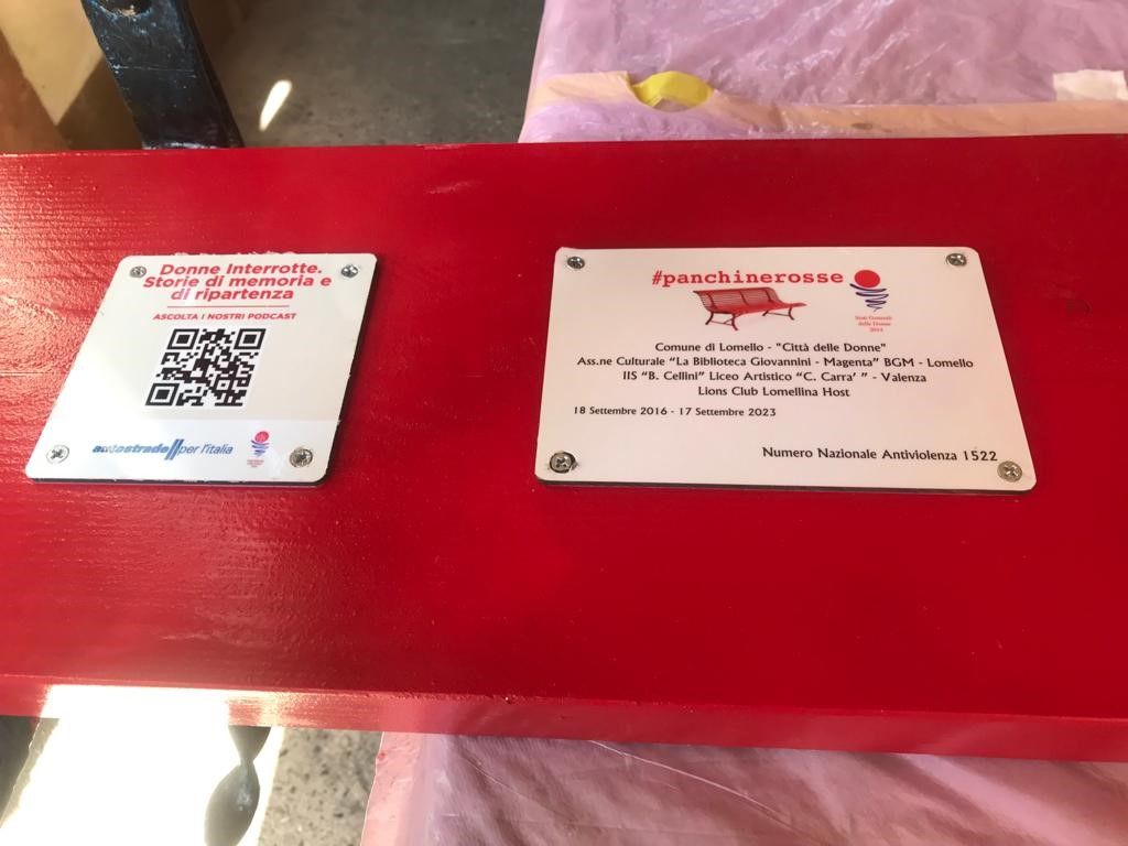 Oggi, grazie alla dinamicità dell’Associazione BGM, presieduta da Tina Magenta (coordinatrice Stati Generali delle Donne Lomellina) e dalla sensibilità del Comune di Lomello, la prima panchina rossa tornerà a risplendere ulteriormente, trovando nuova vita con le evoluzioni del tempo che la renderanno “parlante”. Con la collaborazione di Autostrade per l’Italia, è stata dotata di un QRcode, realizzato insieme agli Stati Generali delle Donne (coordinato dalla pavese Isa Maggi) che sarà in grado di raccontare storie di donne tra violenza e nuova vita. Ricordiamo che da Lomello partì il progetto “Panchine Rosse” proprio grazie alla lungimiranza di Stati Generali delle Donne che lo ha trasformato in un vero e proprio simbolo nazionale ed internazionale (ora marchio registrato). La panchina sarà impreziosita dal dipinto realizzato dalla Professoressa Franca Frassacarro del Liceo Artistico “Carrà” di Valenza con l’aiuto di Alice Girino (ex studente dell’Istituto). Emblematica la scritta posta sulla panchina “In memoria di tutte le donne morte per mano di chi diceva di amarle”. Da sottolineare la disponibilità offerta dai Lions Lomellina Host, guidati da Francesco Trecate, che ha permesso concretamente la realizzazione di questo nuovo progetto.