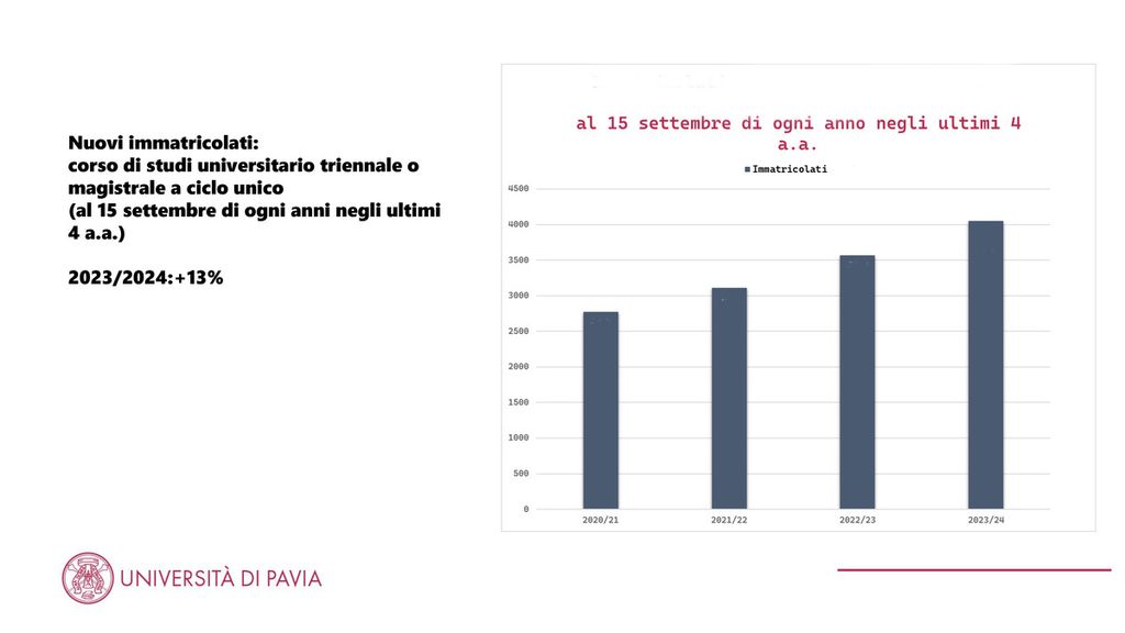 In prossimità dell’inizio delle lezioni per il nuovo anno accademico, l'Università di Pavia regista già un più che significativo incremento delle immatricolazioni, confermando un trend in atto da qualche anno e che ha portato, a registrare l’anno scorso, con 26.083 studenti, il record storico di iscritti all’Ateneo.