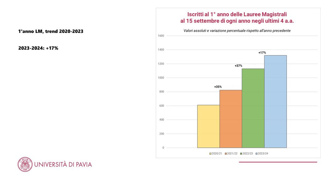 Si rileva anche un forte incremento per i dati relativi agli iscritti al primo anno regolare di una laurea magistrale che superano i 1.300 e sono in crescita del 17% (quasi +200 ingressi assoluti). Sono stati così più che raddoppiati gli iscritti al primo anno nelle magistrali rispetto ai dati registrati nel 2020, confermando l’attrattività dei corsi di 2° livello proposti dall’Ateneo pavese.