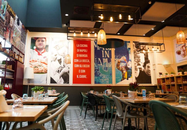 Nel nuovo Rossopomodoro i clienti possono immergersi in un ambiente accogliente, dai profumi e sapori tipici della gastronomia partenopea, che si sprigionano dal forno della pizza e dalla cucina.