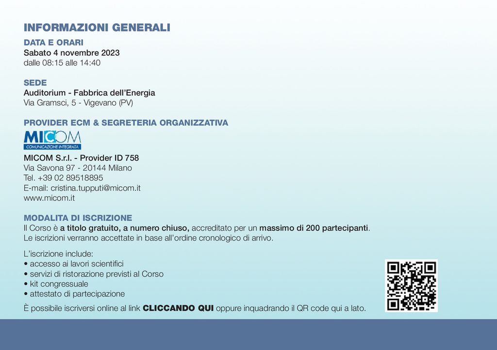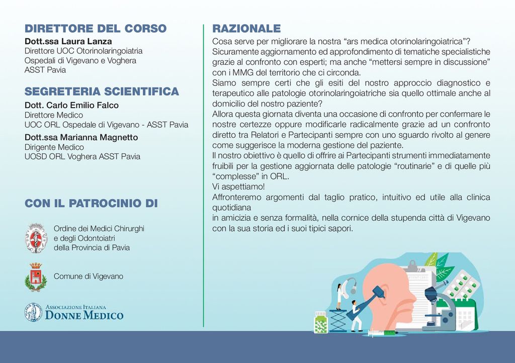 L’obiettivo è quello di offrire ai Partecipanti strumenti immediatamente fruibili per la gestione aggiornata delle patologie “routinarie” e di quelle più “complesse” in ORL. Il Convegno è organizzato dall’UOC Otorinolaringoiatria dell’Ospedale Civile di Vigevano, diretta dalla dott.ssa Laura Lanza, in collaborazione con ATS Pavia, ed ha un taglio molto pratico.
