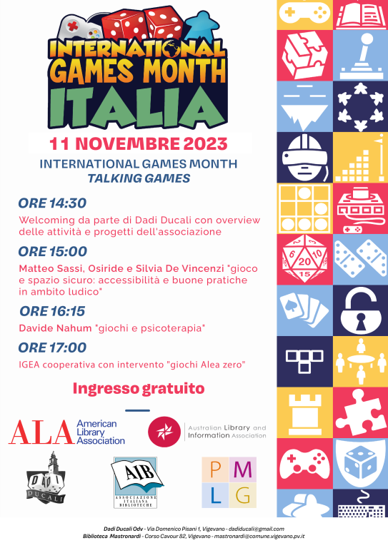 Sabato 11 Novembre 2023, alle ore 14:30, presso la Sala Franzoso della biblioteca L. Mastronardi, Corso Cavour 82 Vigevano, Dadi Ducali organizza, in collaborazione con la stessa, un pomeriggio di conferenze a tema ludico in occasione dell'evento contenitore International Games Month.