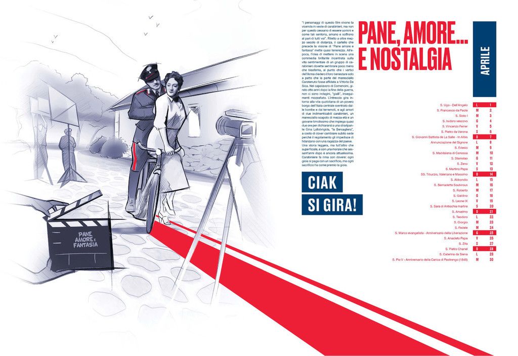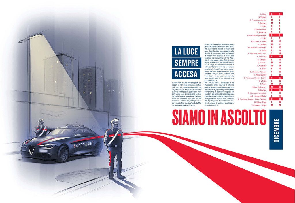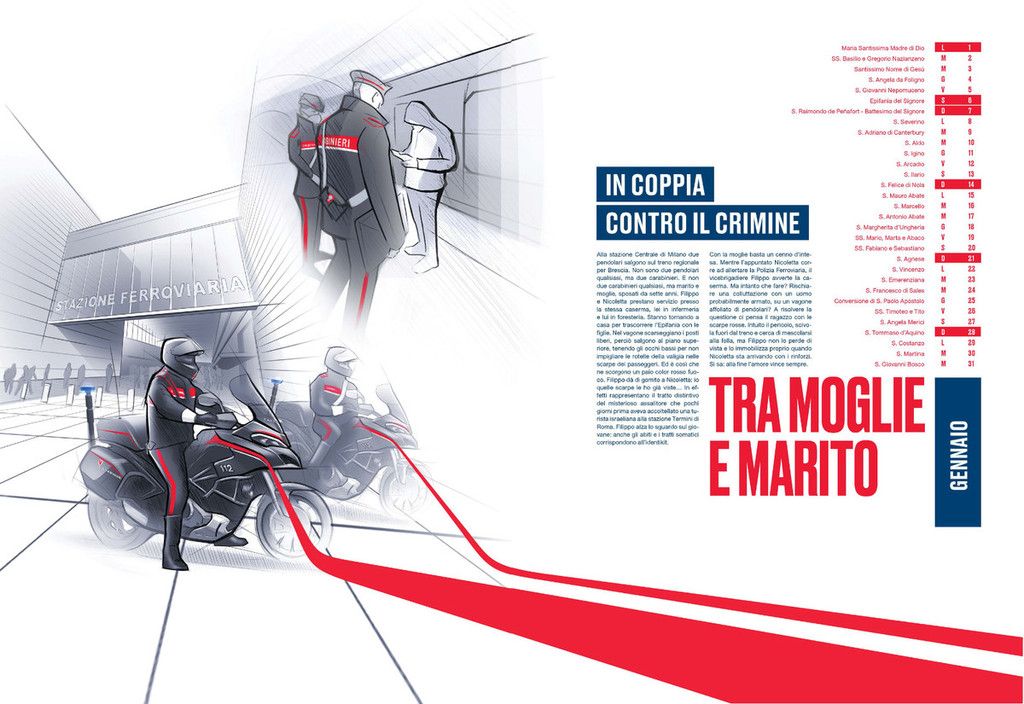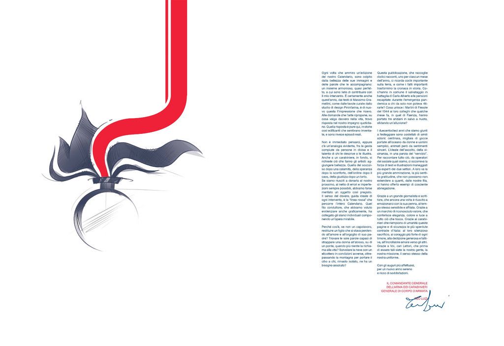 Le 12 storie – eterogenee per epoca storica, ambientazione geografica e avvenimenti narrati – sono unite dalla capacità di ascolto e di vicinanza dell’Arma, “filo conduttore” che attraversa l’intera narrazione del Calendario: una banda rossa creata dalla matita di Pininfarina che parte dalla Fiamma – emblema dell’Arma dei Carabinieri - e avvolge l’intera opera attraverso uno dei segni distintivi più significativi e storici dell’uniforme dell’Arma, che caratterizza i pantaloni del Carabiniere. Una banda che, nell’immaginario delle italiane e degli italiani, è diventata simbolo di una forza amica, sempre presente nei momenti e nei luoghi delle nostre vite. Le illustrazioni che compongono le 12 tavole sono disegnate a matita, tratto che contraddistingue la fase creativa delle opere di Pininfarina - dalle auto sportive ai progetti di architettura - e che valorizza e porta alla luce l’arte presente nell’operato quotidiano dei Carabinieri, come evidenziato dal Comandante Generale “non è immediato pensarci, eppure c’è un’analogia evidente, fra le gesta compiute da persone in divisa, e il talento di chi le descrive o le illustra. Anche ad un carabiniere, in fondo, si richiede ciò che fanno gli artisti: aggiungere bellezza”.