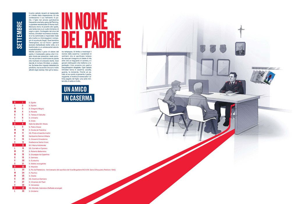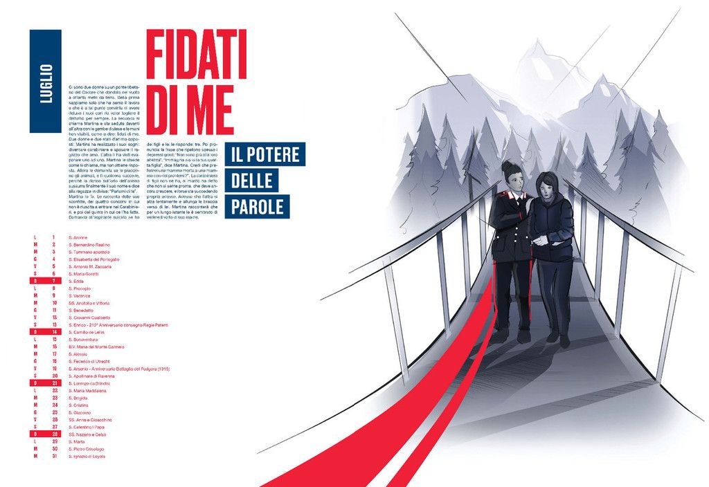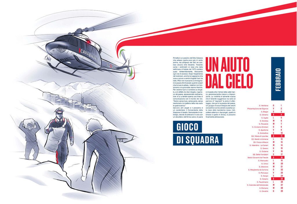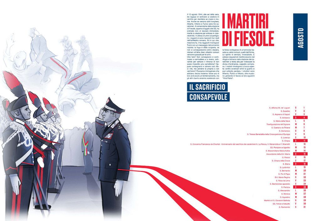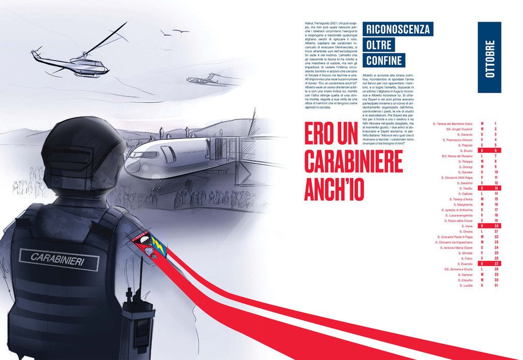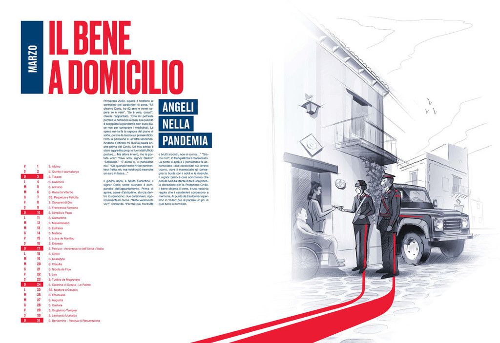 Oltre al Calendario, è stata pubblicata anche l’edizione 2024 dell’Agenda illustrata attraverso quattro racconti dai quali si evince l’essenza del nostro operato. Si tratta di storie di fantasia ispirate alla realtà e capaci di tratteggiare la vera anima del Carabiniere esaltando il messaggio del servizio a favore della cittadinanza e della fiera consapevolezza di adempiere ad un ruolo sociale indispensabile. L’attività di un’unità cinofila impegnata in operazioni di soccorso dopo una calamità naturale, il Carabiniere appena arrivato di rinforzo alla Caserma di un paesino mal collegato e molto distante dai centri maggiori e dai servizi essenziali, la vita di un Ufficiale dell’Arma, ancora ignaro futuro Comandante Generale e inconsapevole protagonista di una pagina di storia della nostra unificanda Nazione. E ancora l’altruismo di un giovane Comandante di Stazione che trae in salvo una donna che stava annegando.