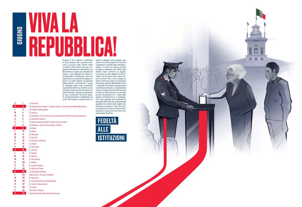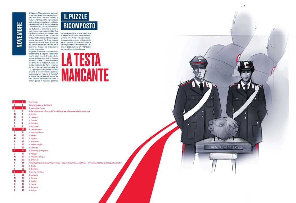 Il notevole interesse da parte del cittadino verso il Calendario Storico dell’Arma, oggi giunto a una tiratura di 1.200.000 copie, di cui oltre 16.000 in otto altre lingue (inglese, francese, spagnolo, tedesco, portoghese, giapponese, cinese e arabo, nonché in sardo e friulano), è indice sia dell’affetto e della vicinanza di cui gode la Benemerita sia della profondità di significato dei suoi contenuti, che ne fanno un oggetto apprezzato, ambito e presente tanto nelle abitazioni quanto nei luoghi di lavoro, quasi a testimonianza del fatto che “in ogni famiglia c’è un Carabiniere”. Iniziata nel 1928, la pubblicazione del Calendario, giunta alla sua 91^ edizione, dopo l’interruzione post-bellica dal 1945 al 1949 venne ripresa regolarmente nel 1950 e da allora è stata puntuale interprete, con le sue tavole, delle vicende dell’Arma e, attraverso di essa, della Storia d’Italia.