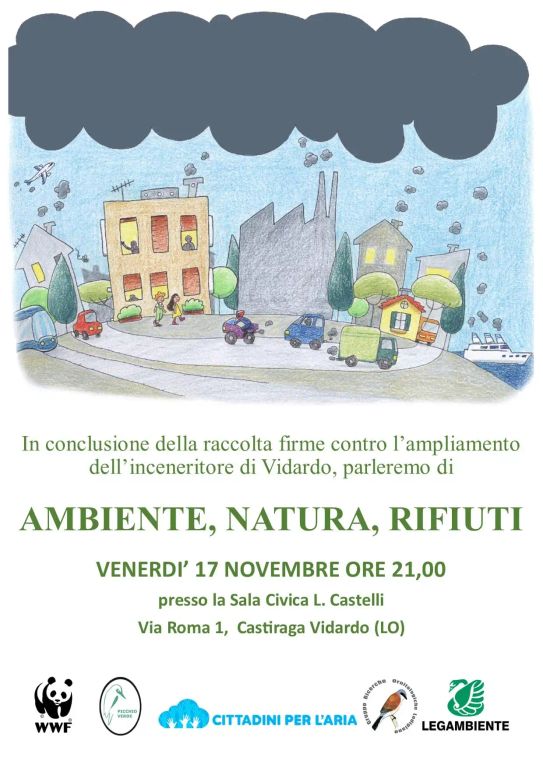“Ambiente, Natura, Rifiuti”, è il titolo della serata a conclusione della petizione contro il quadruplicamento dell’inceneritore di Castiraga Vidardo. La serata ha lo scopo di portare a conoscenza di tutti i cittadini del territorio lodigiano e delle province limitrofe i rischi legati alla presenza di un impianto di tali dimensioni per la salute delle persone, per i danni all’ambiente e al territorio in un epoca di cambiamento climatico in atto.