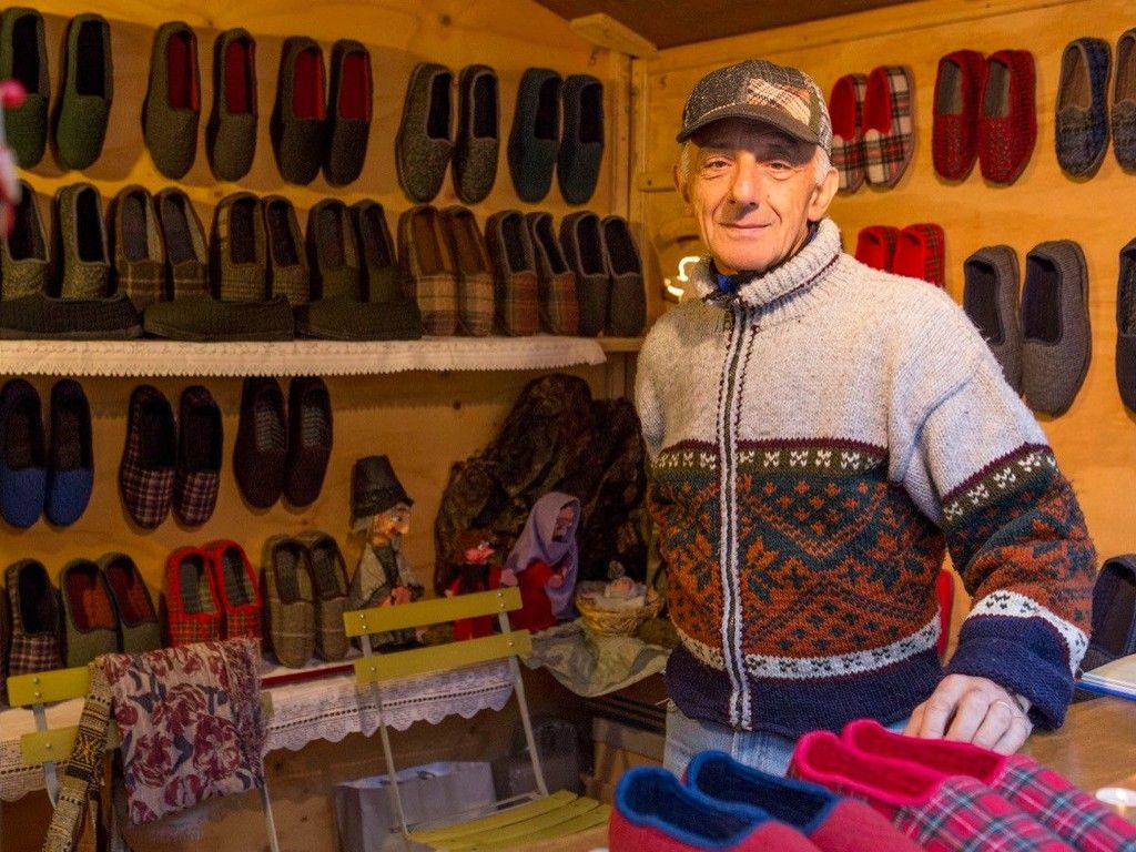 Gironzoliamo tra le casette, facendoci indicare i fedelissimi del mercatino. Sono tre, ci dicono, quelli presenti dal 2002 a tutte le ventuno edizioni. Il primo è Livio Mondin con le sue baite in miniatura, costruzioni in pietra e legno che ci restituiscono l'anima delle nostre alture, il nostro paradiso a pochi metri dal cielo. Ne espone oltre una ventina, capolavori di architettura e pazienza. Poco più avanti incontriamo Daniela Fava Piz, con i suoi piccoli cuscini, sacchetti, cuori e angioletti imbottiti e ricamati a punto croce con fiori, montagne, slitte e renne natalizie. Un'idea regalo delicata. Poi la casetta di Mario De Luca, di poche parole, ma di caldissime proposte: le mufle di Sordevolo, le antiche pantofole in panno, realizzate in pura lana. Ognuna è un pezzo unico, a tinta unita o variegata. Rigorosamente fatte a mano.