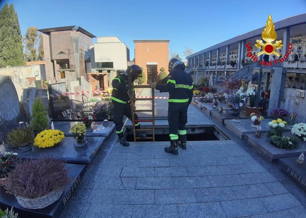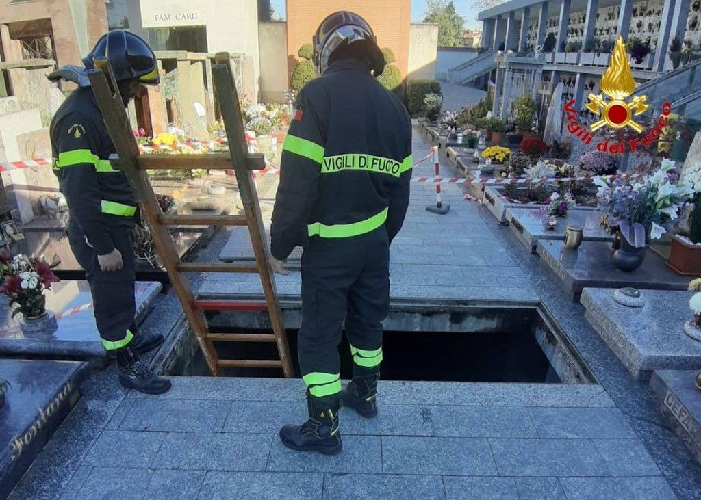 Secondo una prima ricostruzione, un operaio di 58 anni, mentre stava svolgendo l'operazione di tumulazione di una bara, è precipitato da un'altezza di quattro metri.