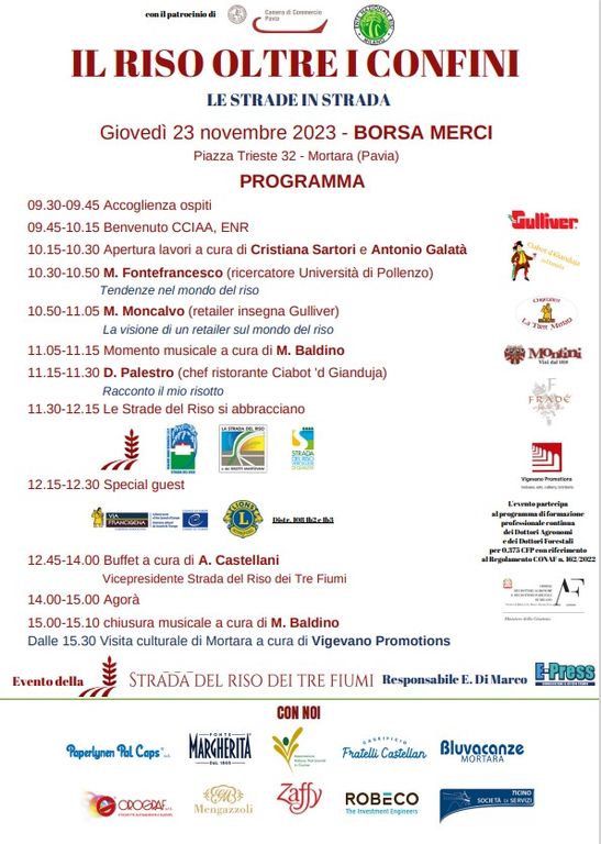 La Borsa Merci della cittadina lomellina sarà teatro del convegno che chiuderà la stagione e che vedrà riunita la comunità del riso in un momento di riflessione e di unione tra le quattro associazioni che danno vita alle altrettante“strade del riso” tra Piemonte, Lombardia e Veneto (oggi il riso è coltivato in ben 9 regioni italiane, Sardegna e Sicilia comprese) Ricco il programma che prevede la presenza dell’Ente Nazionale Risi insieme alla Camera di Commercio, di esperti e ricercatori del settore, un momento musicale, gli assaggi a cura di A. Castellani, Vicepresidente dell’Associazione ed una visita guidata, nel pomeriggio, al centro storico di Mortara a cura di Vigevano Promotions.