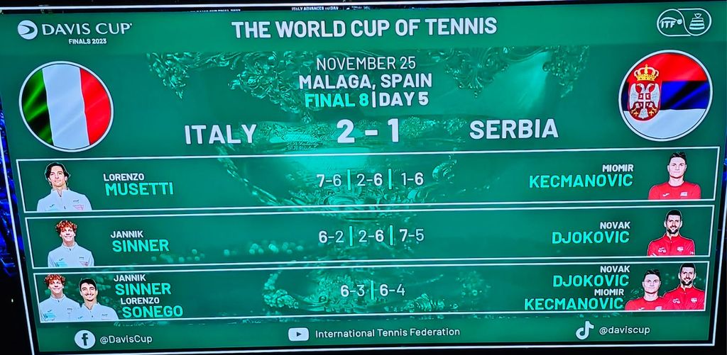 La sfida con la Serbia non era partita bene per gli azzurri che hanno perso il primo singolare con Musetti che dopo aver vinto il primo set cede nettamente gli altri due. Poi scende in campo Sinner e la musica cambia: Jannik batte in tre set Djokovic.