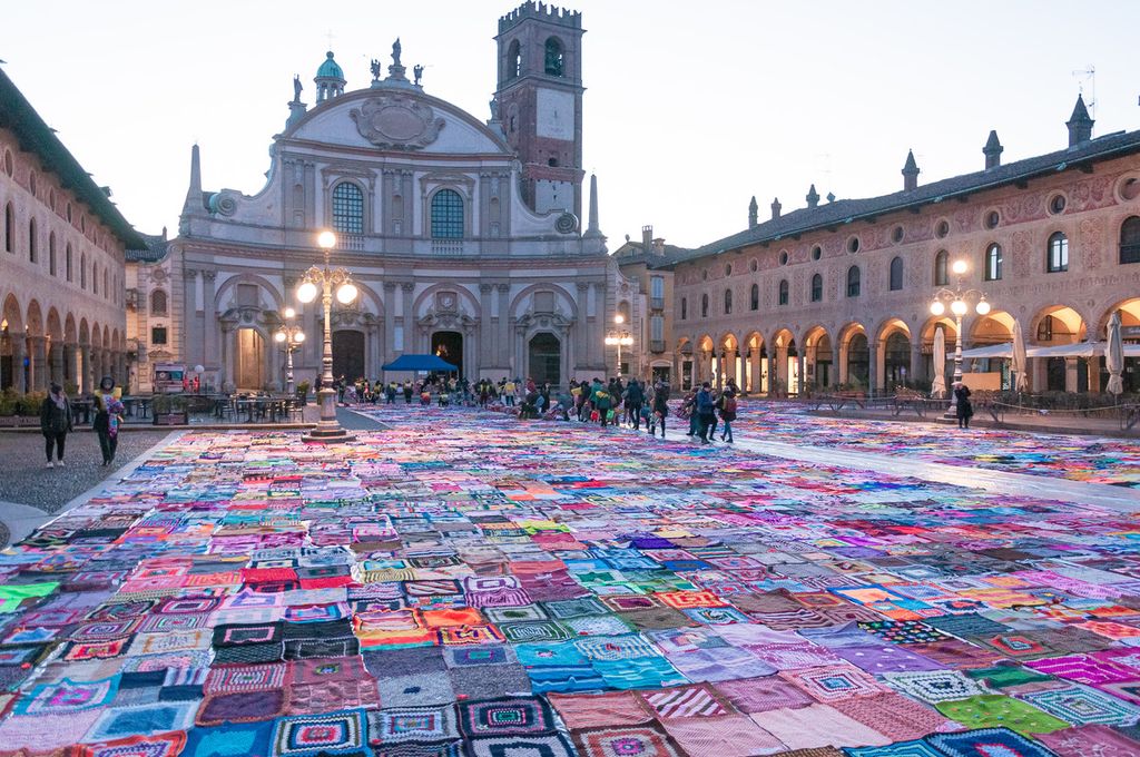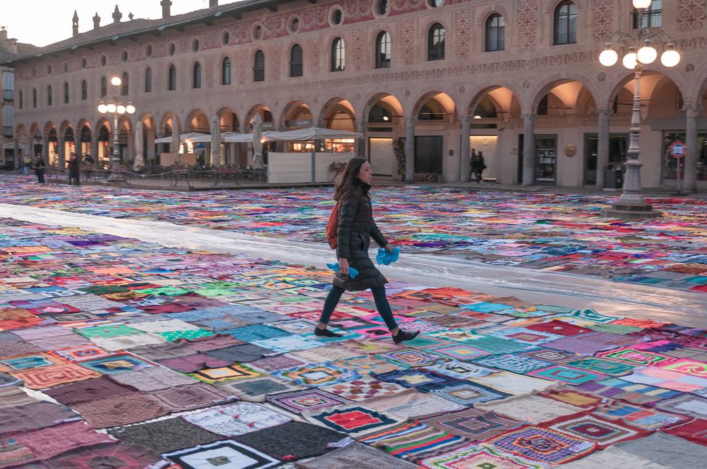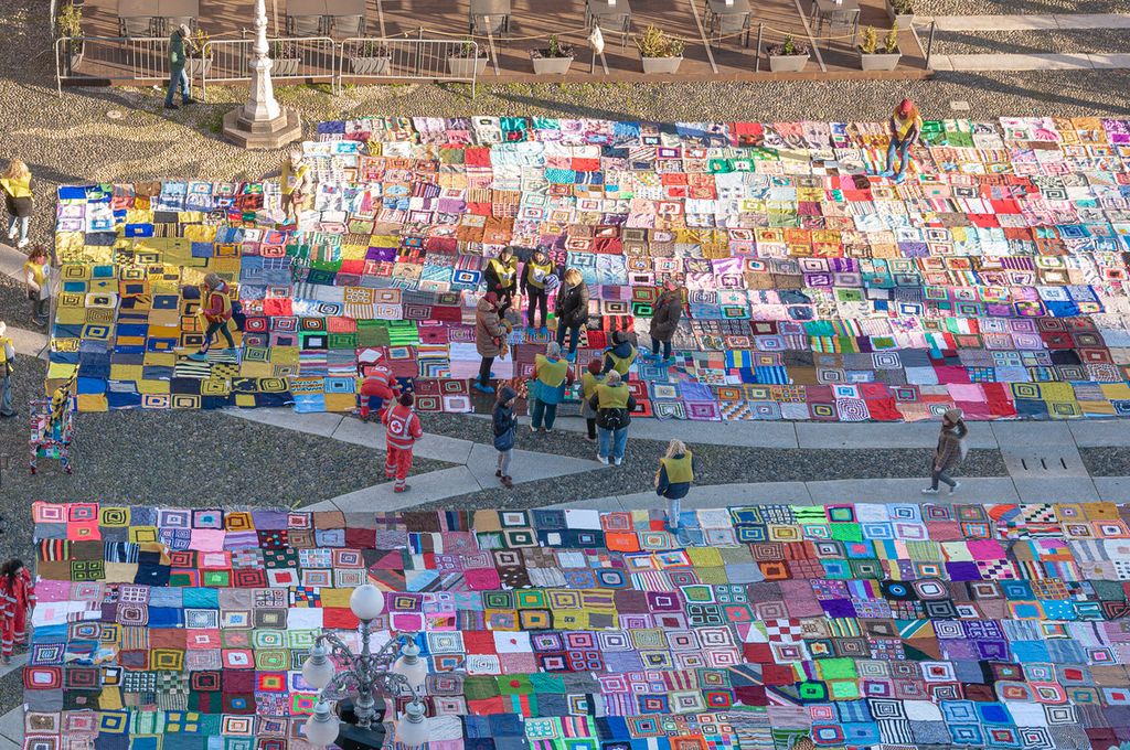 Sulla pavimentazione della Piazza hanno trovato posto oltre 3500 coperte cucite nel corso dei mesi da centinaia di persone e che sono state vendute per poter realizzare sul territorio il progetto “A.D.A. – Aiuto alle Donne per l’Autonomia” di Kore Centro Antiviolenza, capofila dell’iniziativa.