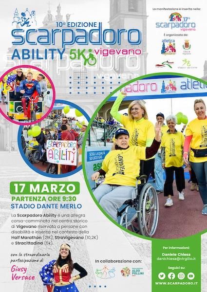 La partenza della Scarpadoro Ability, così come per tutte le altre distanze (21K-10,2K-5K) è prevista alle ore 9.30 dallo Stadio Comunale Dante Merlo. Il percorso dell'Ability si svilupperà, come sempre, lungo i primi 5 chilometri del tracciato della mezza maratona, passando per Piazza Ducale, il Castello Sforzesco e lungo le strade più suggestive del centro storico di Vigevano per poi fare ritorno allo Stadio.