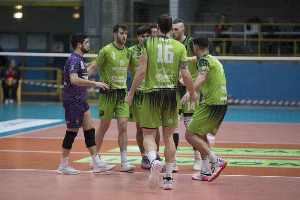 Coach Galimberti chiama il doppio cambio con Pedroni e Vattovaz per spingere i neroverdi ad una risposta più decisa, ma i muri di Maletti e Aprile consegnano il set a Bologna (25- 16). Faticano i neroverdi all’inizio del quarto set, e i numerosi errori sovrastano i punti di Orlando e Martinez (8-4). Con Peslac a muro e Puliti in attacco, la Moyashi prova a riagganciare Bologna, ma i padroni di casa non desistono e si portano sul 16-13. Entrano in campo Vattovaz e Pedroni, ma il cambio non sortisce effetto e Listanskis porta i suoi sul 21-16.