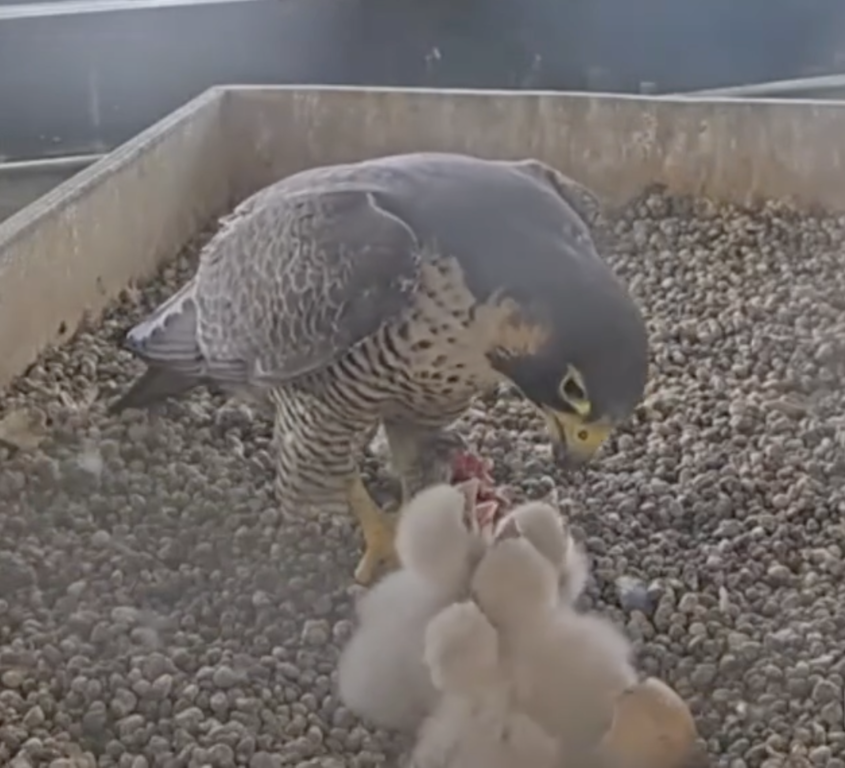 Dal primo all'ultimo nato sono trascorsi 4 giorni, tanti per degli animali che crescono velocemente come i falchi, ma questo, come già sperimentato negli anni scorsi, non è un problema, i genitori continueranno ad accudire con pari dedizione ciascun piccolo, in base alle esigenze alimentari della sua età.