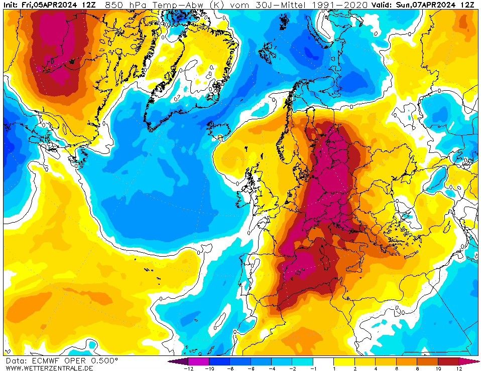 «Sarà un fine settimana soleggiato e molto mite, con un primo assaggio estivo per domenica (si definisce estiva una giornata con massima di almeno 25°C) - annuncia Bertoni - Lo zero termico raggiungerà i 4.000 metri. Molto mite anche in montagna. L'anomalia termica sarà notevole su buona parte dell'Europa centro occidentale (anche 12°C oltre la norma). Sulle nostre zone l'anomalia sarà più contenuta (6-8°C) ma sempre importante».