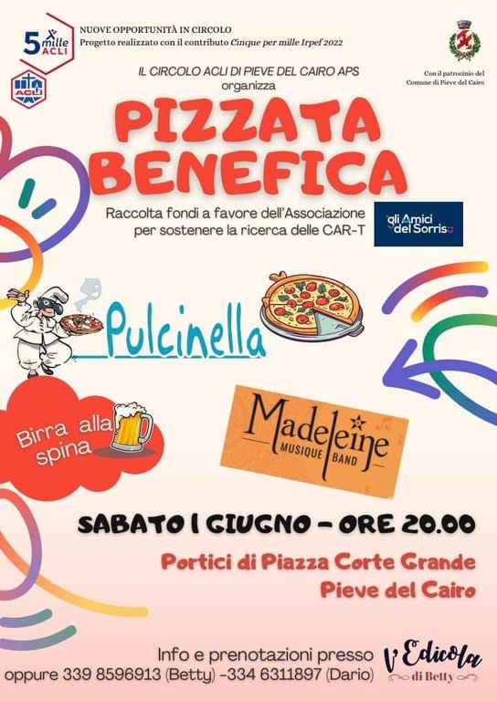 L'evento è stato promosso dal circolo Acli di Pieve del Cairo Aps per raccogliere fondi in favore delle CAR-T (Gli Amici del Sorriso). Presenti 310 persone che hanno potuto degustare le pizze di "Pulcinella" in compagnia della "Madeleine musique band", che ha allietato la serata sotto i portici di piazza Corte Grande.
