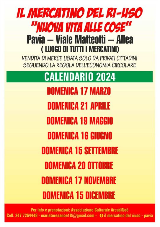 La manifestazione ideata dall’Associazione Culturale l’Arca di Noè, con il patrocinio del Comune di Pavia, raccoglie consensi e successi: centinaia le adesioni di privati cittadini di Pavia e provincia che animano ogni appuntamento mensile con l’economia circolare. L’associazione, con questo progetto, persegue non solo finalità di cultura ambientale, attraverso un riciclo attivo di oggetti usati ma anche di socializzazione tra le persone, consentendo la partecipazione a rotazione, previa prenotazione, dei cittadini partecipanti.