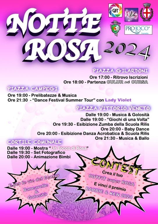 L’evento si colloca all’interno della Notte Rosa, organizzata dal Comune di Tromello insieme alle varie associazioni e commercianti locali. Il centro del paese sarà chiuso al traffico per far spazio a esibizioni di ballo, aree ristoro, bancarelle, giochi, mostra fotografica, animazione per i bambini; alle ore 21.30 in piazza Campegi è prevista l’esibizione dell’artista dance Lady Violet, mentre per tutta la serata sarà possibile partecipare al contest “Barbie & Ken 2024” presentando l’outfit rosa più originale.