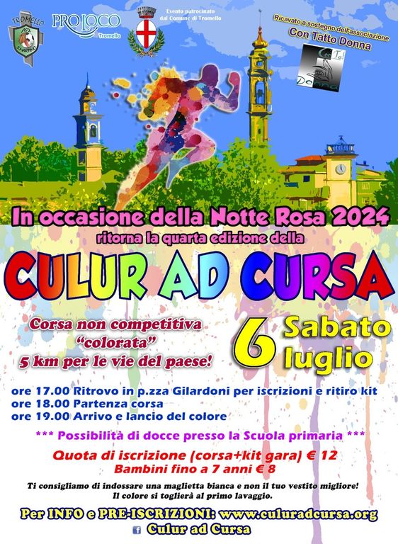 Sabato 6 luglio, in occasione della Notte Rosa 2024, torna a Tromello la quarta edizione della “Culur ad Cursa”, la corsa non competitiva “colorata” di 5km per le vie del paese. Un evento ricco di colori, musica, festa e allegria, promosso dall’Associazione Sportiva Dilettantistica San Martino Tromello in collaborazione con la Pro Loco, l’AVIS e patrocinato dal Comune di Tromello.