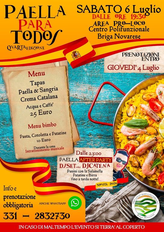 Torna un grande classico della Pro Loco “San Colombano” di Briga Novarese: Il prossimo sabato 6 Luglio si organizza la quarta edizione di “Paella para todos”.