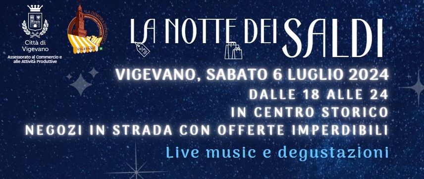 Dopo il grande successo riscontrato da "Vigevano in Festa", il Comune di Vigevano è lieto di annunciare il secondo evento dedicato al rilancio del commercio della nostra città: La Notte dei Saldi che si svolgerà Sabato 6 luglio a partire dalle ore 16 fino alla mezzanotte. L'iniziativa, organizzata dallo Sportello delle Attività Produttive attraverso il Distretto Urbano del Commercio “La Dimora Sforzesca” e in stretta collaborazione con i commercianti locali, promette di essere un altro appuntamento imperdibile per cittadini e visitatori.
