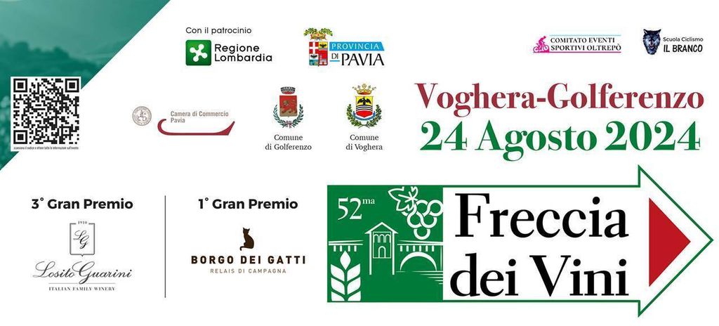 La 52.a edizione della tradizionale “Freccia dei Vini” è in programma per sabato 24 agosto e per la prima volta nella storia la sua partenza avrà una location inedita. Per il 2024 si parte da Voghera e si arriva a Golferenzo, in una corsa in linea da 124 km completamente immersa nell’Oltrepò Pavese.