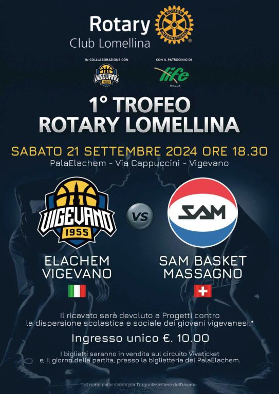 Continua la prevendita online dei biglietti per la prima edizione del Trofeo Rotary Lomellina", in programma sabato 21 settembre alle ore 18.30 al PalaELAchem fra ELAchem Vigevano e Sam Basket Massagno, vicecampione di Svizzera, ultima amichevole prestagionale della formazione guidata da Lorenzo Pansa, che giovedì 19 affronterà sempre al palazzetto di via Cappuccini alle ore 18 (ingresso gratuito) la formazione di Desio, militante in serie B nazionale).