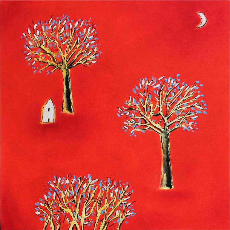 Nella suo operare Gianni Mantovani sempre di più spesso affronta le tematiche ambientali e sente l’urgenza di confrontarsi sui problemi legati ai cambiamenti climatici e al surriscaldamento del pianeta. Scrive in proposito Edoardo Maffeo, presentatore della mostra: “Sebbene per anni il senso comune non sia riuscito a metterne a fuoco l’entità e l’imminenza, argomenti attuali e preoccupanti come il cambiamento climatico e il riscaldamento globale offrono all’artista spunti in abbondanza per un racconto funzionale a una rilettura critica del sistema uomo-natura. L’obiettivo resta quello di sensibilizzare e spiegare i tanti perché questi cambiamenti stanno avvenendo, quali sono le evidenze e gli impatti anche da un punto di vista culturale e sociale, come tutti noi si possa agire per frenare i tanti, troppi, comportamenti autodistruttivi dell’uomo ed evitare che questo processo degeneri in una tragica ed irreversibile crisi sistemica. Poi, come sempre, è un problema di “toni”: come nella vita di tutti i giorni anche nel mondo dell’arte c’è chi strilla, chi provoca, chi graffia e chi batte la grancassa. Per fortuna c’è anche chi, pur preoccupato ed indignato per la mancanza di una consapevolezza collettiva sui temi ambientali, riesce ancora a porgere allo spettatore il suo messaggio, forte e chiaro, con l’estrema eleganza del segno e la delicata poesia del colore. Ho sotto gli occhi decine di immagini delle opere di Gianni Mantovani, sono sopraffatto dall’essenzialità e sobria, ma credetemi tutt’altro che ingenua, semplicità delle sue composizioni. Orizzonti alti e tesi punteggianti da monti rigorosamente triangolari e rilievi tondeggianti, il profilo di qualche piccolo edificio bianco, delle barchette con le vele spiegate, ciuffi d’erba, arbusti e alberi, a volte solitari, a volte maestosi ma rinsecchiti. Tutto qui, quasi all’infinito. Nessun essere vivente, nessuna presenza umana? Un vuoto solo apparente poiché la rada dissemina di casette bianche, sulla scorta della lezione di Carl Gustav Jung, non ci narra di solidi edifici, di spazi reali ma di allegorici spazi dell’Io, anzi, di una costante coscienza individuale che si pone al centro della scena. Ad accendere questi panorami desolati, senza tempo e senza luogo, provvedono quei rossi laccati, a volte brillanti a volte ombrosi, che si sciolgono nello spazio del cielo e della terra, i neri, profondi, delle occasionali pozze d’acqua, quei gialli e bianchi che, freddi, segnano i confini tra il tutto ed i pochi elementi formali presenti nella composizione. Se i colori sono un non velato omaggio alla sua tanto ammirata arte tribale africana, il sapiente uso narrativo, emozionale e simbolico che ne fa è tutto suo: la terra arde, il caldo ci soffoca, il pericolo è imminente e l’allarme è da tempo scattato. Nell’opera di Mantovani c’è una realtà che è la realtà intellettuale e c’è lo spazio, ma è lo spazio che vive dentro di noi, egualmente reale come lo spazio misurabile del nostro mondo esterno. Siamo in piena metafora, con un atto di lucida semplicità, di completo abbandono alle immagini interiori, cercando di tornare all’essenza, come hanno fatto i popoli primitivi, e come fanno i bambini, cercando di ritrovare il segreto perduto dell’innocenza. L’artista abbandona la loquacità espressiva che purtroppo caratterizza tanta figurazione contemporanea per lasciar posto all’espressione delle trame essenziali. Ed è proprio questa narrazione del mezzo, questa concentrazione sulla maggior forza espressiva possibile di ogni segno che dona una efficacia poetica.”