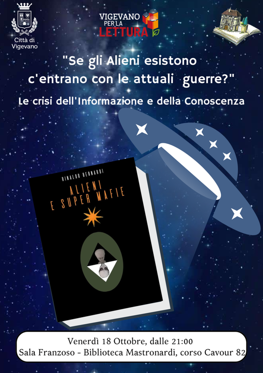 "Se gli Alieni esistono c'entrano con le attuali guerre?" è il titolo di un incontro che si terrà venerdì 18 ottobre presso la biblioteca civica Lucio Mastronardi, in Sala Franzoso. Interviene il giornalista professionista Rinaldo Bernardi autore del libro: "Alieni e super Mafie" uscito pochi mesi fa.