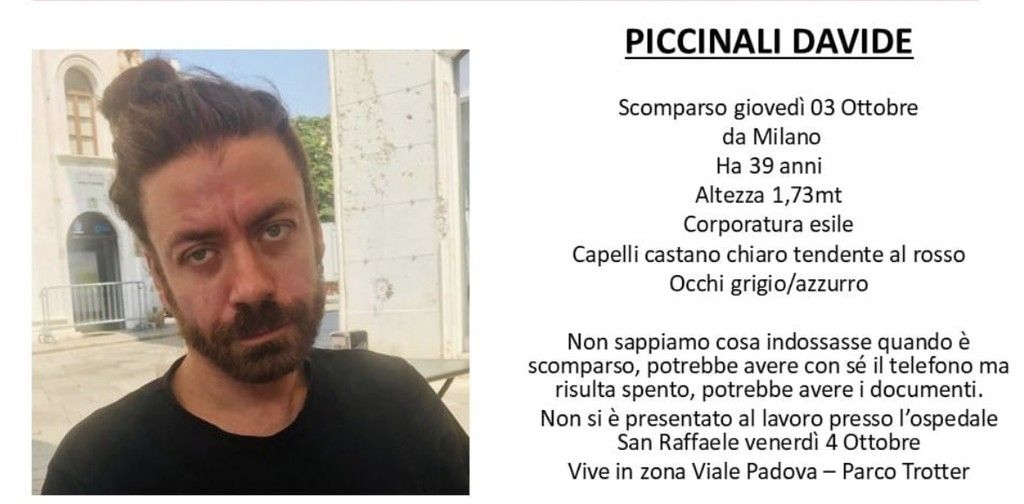 L'appello della famiglia è stato diffuso anche da Penelope Lombardia, con tutti i dati per il riconoscimento. Il medico ha 39 anni, è alto 1,7, ha i capelli castani tendenti al rosso e occhi grigio-azzurri. Il telefono risulta spento. Non si è presentato al lavoro venerdì 4 ottobre e da allora non si sa più nulla di lui.