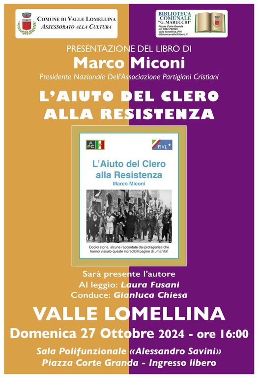 Domenica 27 ottobre, alle ore 16:00, sarà ospite nella sala polifunzionale “A. Savini”, in piazza Corte Granda, Marco Miconi, che presenterà al pubblico il libro L’Aiuto del Clero alla Resistenza, di cui è autore. L’incontro, organizzato dalla Biblioteca “G. Marucchi”, ha lo scopo di contribuire a mantenere vivo il ricordo di una pagina importante e significativa della nostra Storia nazionale – una pagina di fulgida positività all’interno di un volume tragico forse come nessun altro, quale è stata la Seconda Guerra Mondiale. Nativo di Zeme, architetto e urbanista, Marco Miconi ricopre, dal 2021, la carica di Presidente Nazionale dell’Associazione Partigiani Cristiani, fondata da Enrico Mattei nel 1947, e che Miconi ha contribuito a rifondare nel 2015.