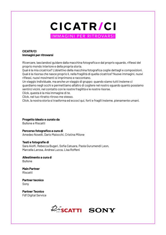 Qual è la mia cicatrice? È la domanda che i beneficiari della Fondazione Bullone – che accompagna adolescenti e giovani adulti con esperienze di patologie importanti alla riscoperta della propria identità oltre la malattia, costruendo insieme percorsi di reinserimento nella vita sociale e professionale – si sono posti lasciandosi guidare dalla macchina fotografica e dal proprio sguardo. Un viaggio individuale, ma anche un viaggio di gruppo: quando siamo tutti insieme ci guardiamo negli occhi e permettiamo all’altro di cogliere nel nostro sguardo quanto possiamo sentirci vicini, nel contatto con le nostre fragilità e le nostre risorse.
