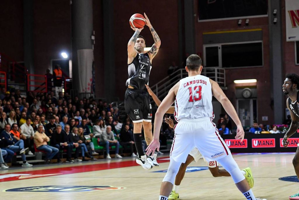 Senza Severini out per problemi fisici e per quasi tutto il primo tempo di Kuhse per i 2 falli a carico dopo nemmeno 5 minuti, Baldasso trova proprio a ridosso della sirena dell’intervallo i punti – gliene mancavano 9 alla vigilia – per raggiungere il traguardo dei 1000 segnati in carriera in Serie A con un arresto e tiro dal gomito della lunetta per il 37-43 di metà gara. Nella ripresa il rientro di Kuhse e le ottime giocate di Weems e di un tonante Kamagate ridanno energia al tifo di casa e alla squadra per rientrare in partita (66-69 al 33’). Il chirurgico Brooks sembra far riallungare Trieste in modo quasi irrimediabile, ma 4 punti di fila di Gorham portano addirittura la Bertram a una sola lunghezza di distanza per il 79-80 a soli 40” dalla fine. Sull’apice dell’entusiasmo del PalaEnergica, tre liberi di Valentine e una schiacciata di Brooks in contropiede sembrano mettere nuovamente il punto sul successo ospite, 79-85 a -13”. La Bertram, però, ha ancora un ultimo sussulto insperato: tripla immediata di Kuhse e recupero difensivo di Candi su uno sfondo subito, prima che la corsa di Vital per il tiro da tre del possibile supplementare termini sul ferro a 2” dal termine.