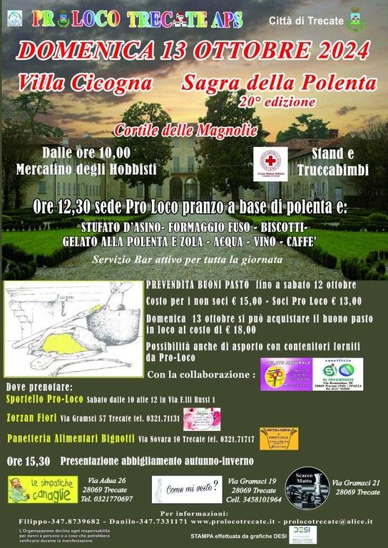 La Città di Trecate è pronta a festeggiare la ventesima edizione della “Sagra della Polenta”, un evento imperdibile che si terrà domani 13 ottobre nel cortile delle magnolie di Villa Cicogna. Organizzata dalla Pro Loco con il patrocinio dell’Amministrazione comunale, la sagra promette di essere una giornata all’insegna della gastronomia, dell’arte e della cultura locale.