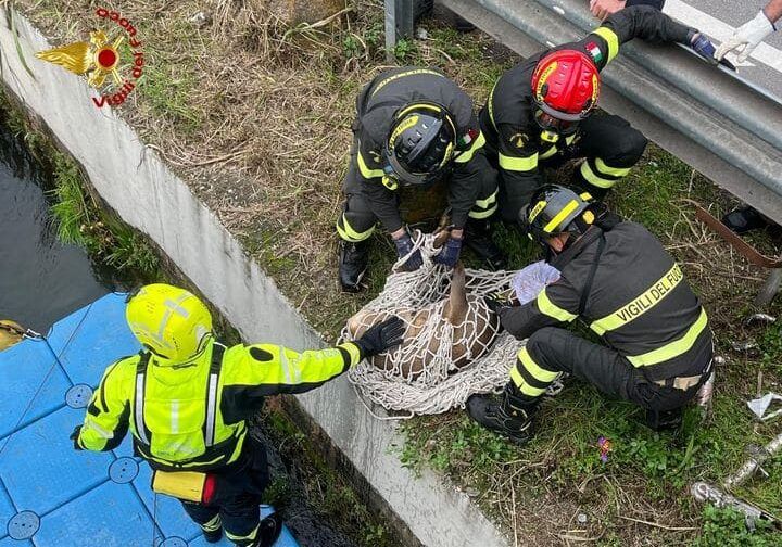 Si avventura nelle acque del Naviglio milanese e resta bloccato. E’ capitato a un capriolo maschio, salvato questa mattina dal nucleo speleo-alpino-fluviale (Saf) del vigili del fuoco di Milano.