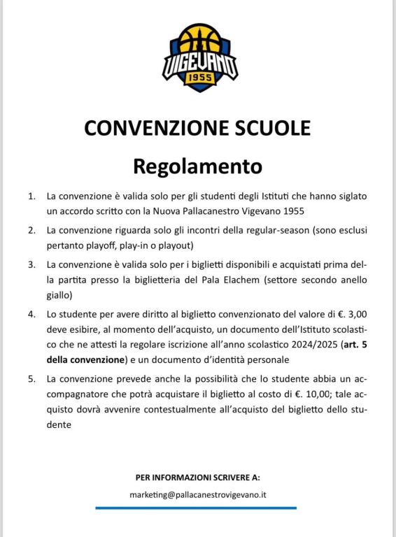La convenzione riguarda solo gli istituti che ne hanno fatto espressa richiesta inviando una mail a: marketing@pallacanestrovigevano.it, e sarà valida fino ad esaurimento dei posti destinati all'iniziativa. Le condizioni generali sono quelle espresse dalla convenzione che viene richiesta e siglata tra le parti.