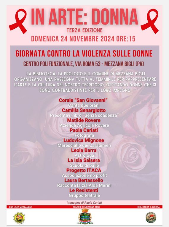 In occasione della Giornata internazionale per l'eliminazione della violenza contro le donne, la biblioteca Silvia Guerra di Mezzana Bigli, la Pro Loco Mezzanese e il Comune di Mezzana Bigli organizzano un evento tutto al femminile giunto alla terza edizione: "In Arte: Donna" si terrà domenica 24 novembre a partire dalle 15 presso la Sala Luigi Secondi del Centro Polifunzionale di Mezzana Bigli, Pv (via Roma 53).