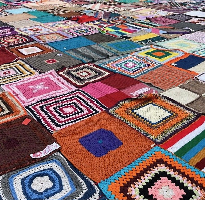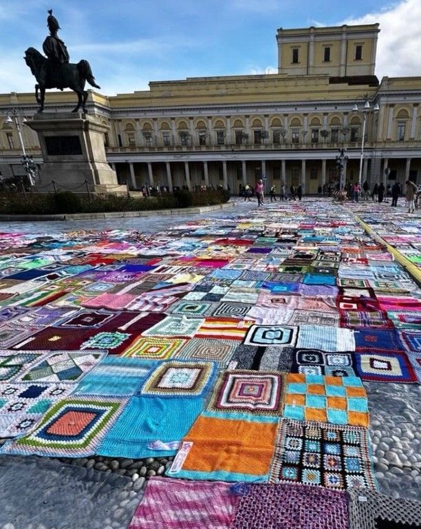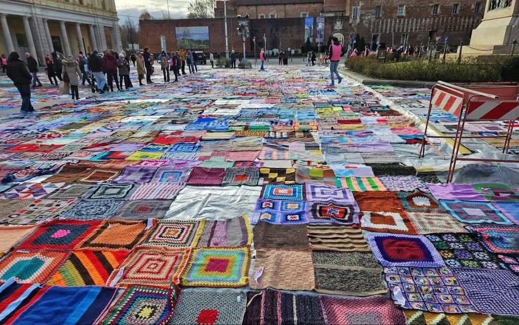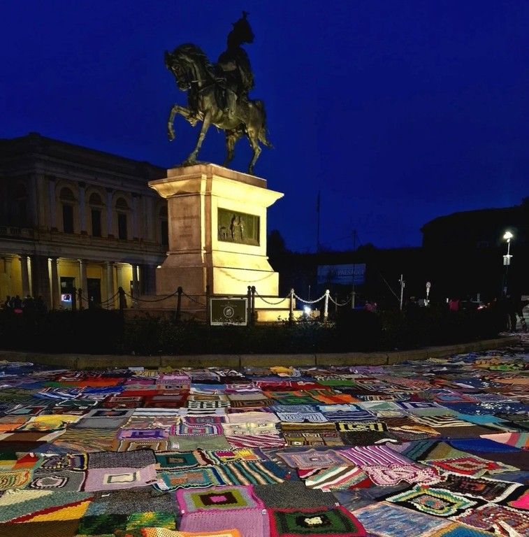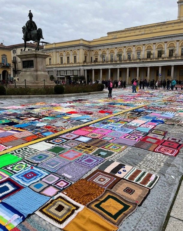 In totale, sono stati realizzati oltre 12.000 quadrati di maglia necessari per confezionare le coperte che hanno tappezzato la piazza.