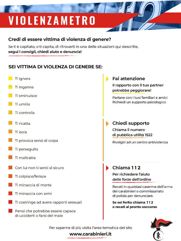 Inoltre, sul sito www.carabinieri.it, è stata dedicata un’intera sezione al “codice rosso”, che offre informazioni sul fenomeno e sugli strumenti di tutela delle vittime, mettendo a disposizione un test di autovalutazione, denominato “Violenzametro”, che rileva il livello di violenza subita in un rapporto di coppia (http://www.carabinieri.it/in-vostro-aiuto/consigli/codice­rosso/codice-rosso).