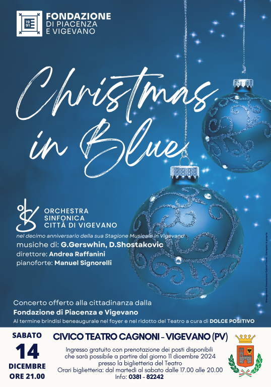 L’attesa del Natale al Teatro Cagnoni si celebra con un concerto gratuito offerto alla città dalla Fondazione di Piacenza e Vigevano. L’evento è in programma sabato 14 dicembre alle 21 e vedrà protagonista l’Orchestra Sinfonica Città di Vigevano che, in occasione del decennale della sua stagione musicale, proporrà Christmas in blue: musiche di Gershwin e Sostakovic, la direzione di Andrea Raffanini e Manuel Signorelli al pianoforte.