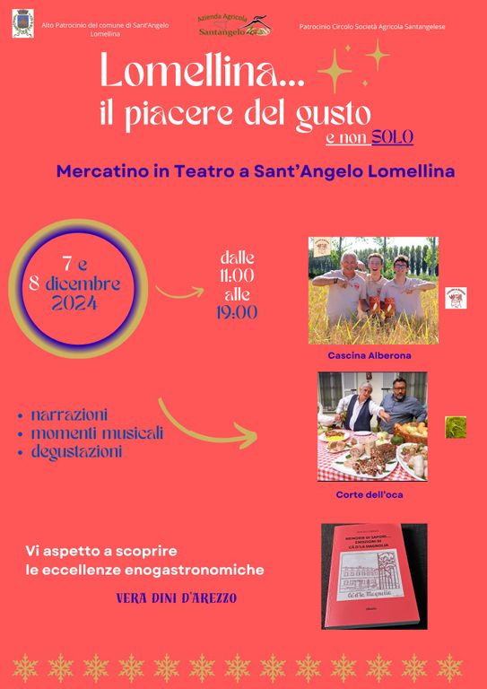 Il Teatro dell’Associazione Agricoltori Santangelesi di via dott. Mazzini ospiterà il “Piacere del gusto” il primo mercatino della Lomellina dedicato alla scoperta delle eccellenze del territorio e non solo. Il mercatino natalizio, che è patrocinato dal Comune di Sant’Angelo e dall’Associazione Agricoltori Santangelesi, sarà l’opportunità non solo per degustare prodotti tipici come i salumi d’oca di Mortara, il riso Carnaroli e il Caviale, ma anche per ascoltare i canti natalizi, i canti delle mondine e narrazioni che mettono la tradizione culinaria agricola Lomellina al centro.