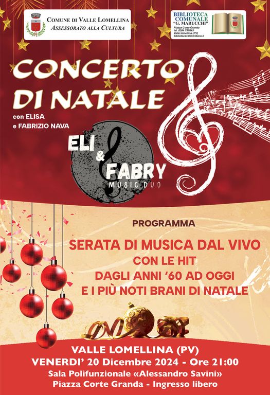 Il Natale si avvicina, portando con sé, oltre a un’atmosfera che ci auguriamo pervasa di serenità e della vicinanza degli affetti più cari, anche una serie di iniziative culturali di vario tipo. A tale proposito, la biblioteca comunale ”Giuseppe Marucchi”, unitamente all’assessorato alla Cultura di Valle Lomellina, è lieta di comunicare che la sera di venerdì 20 dicembre, alle ore 21:00, in sala polifunzionale “Alessandro Savini” si terrà il “Concerto di Natale con il duo ELI & FABRY (voci).