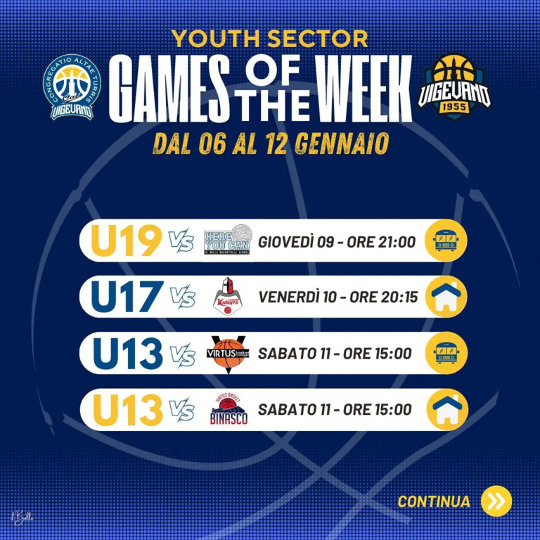Venerdì 10 tocca invece all'under17 Uisp affrontare la prima in classifica, il Legnano Basket Knights. Sabato 11 spazio all'under13 Uisp in trasferta contro la Virtus Basket Casteggio, mentre l'under13 regionale e l'under 14 regionale iniziano la seconda fase dei rispettivi campionati tra le mura amiche affrontando Virtus Basket Binasco e Ebro Basket Milano.