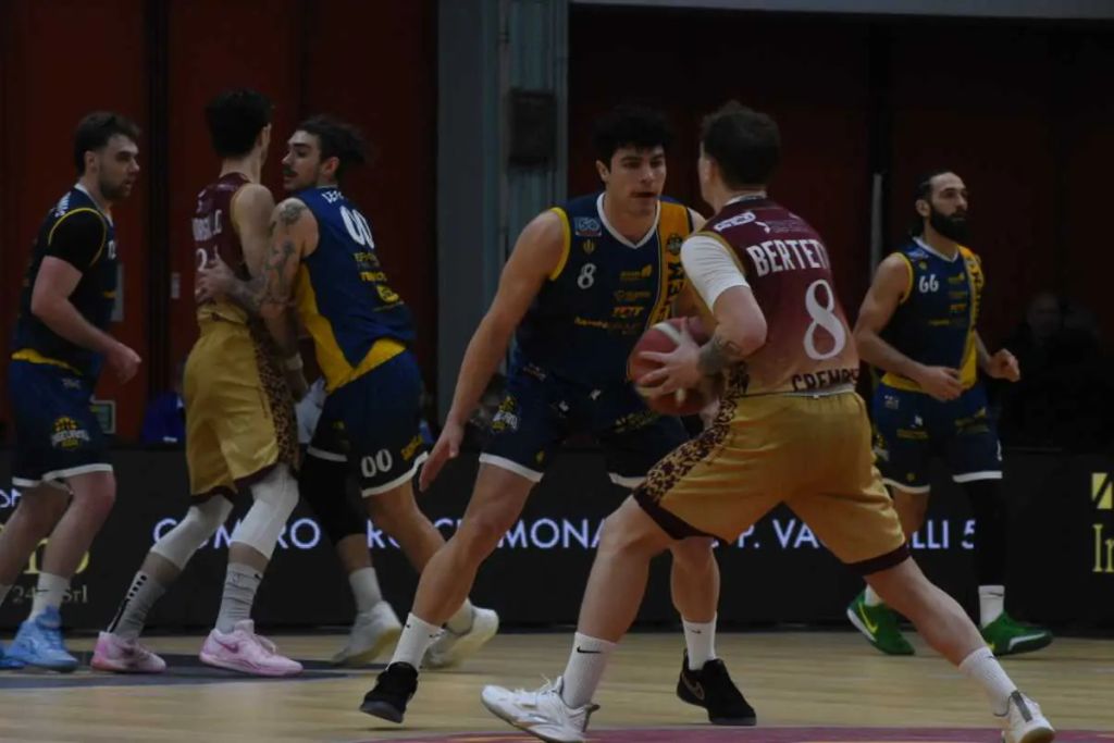 Vigevano perde nettamente lo scontro diretto a Cremona per 92-73 in una partita in cui i ducali sono rimasti a galla solamente nei minuti iniziali, quando sembravano entrati bene nel match, andando sul 4-9 con i punti segnati da Leardini. Ma è stato un fuoco di paglia, perché gli oroamaranto guidati dalll'ex di giornata Gianmarco Bertetti (26 punti alla fine con con7/10 da tre punti) hanno mostrato i muscoli sotto i tabelloni, vincendo nettamente la battaglia ai rimbalzi (44 a 32) e prendendo il largo nettamente nel secondo quarto, in cui è stato scavato il solco decisivo che nel secondo tempo si è addirittura allargato.